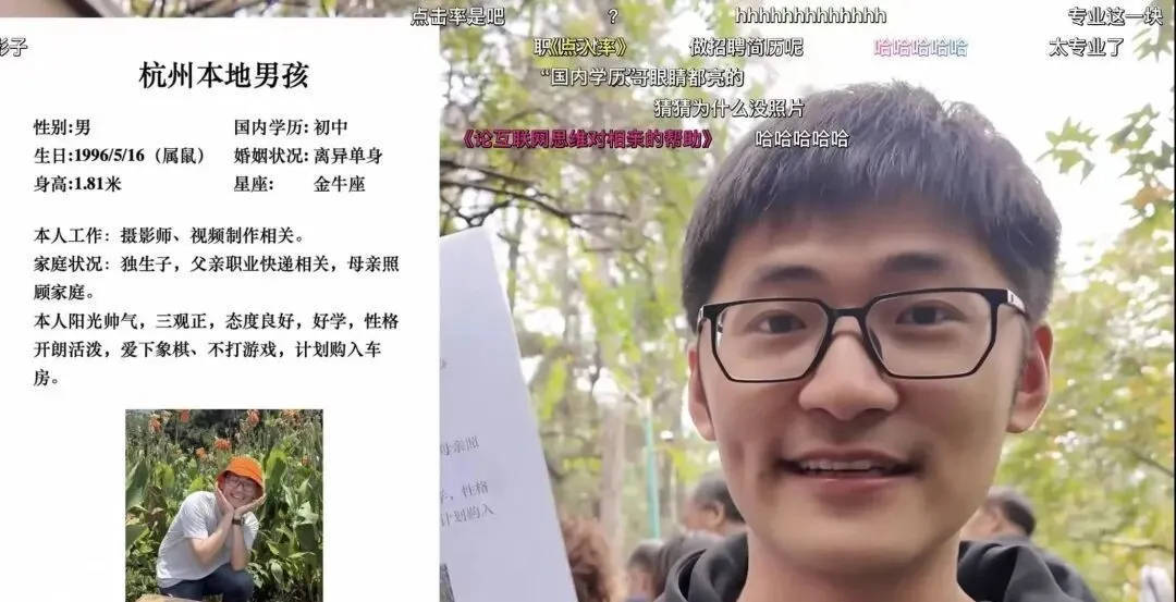 他展示自己的相亲简历,把自己塑造成杭州本地29岁离异的人设,父亲职业快递相关,母亲照顾家庭,并称自己“计划购入车房”。